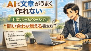 AIで文章がうまく作れないと悩む士業の方へ。ホームページで何を書けばいいか分からない原因と、問い合わせにつながる書き方を解説。AIライティングがうまくいかない理由と、“考えずに書ける型”を使った改善方法も紹介します。